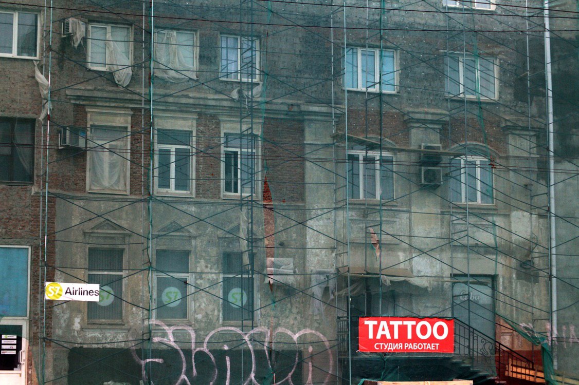Во время ремонта фасада дома на Красном пути 10, когда содрали старую штукатурку, стало очень четко видно, что пятиэтажка эта "составная". В основе - дореволюционный кирпичный двухэтажный особняк с интересными окнами и каменными наличниками. Выше уже в советские годы была сделана надстройка из шлакоблочного кирпича.