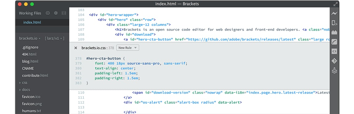 Brackets.io — Легковесный кроссплатформенный редактор, адаптированный для работы с сайтами. Одна из лучших функций brackets – мини-редактор, встроенный в основной код.