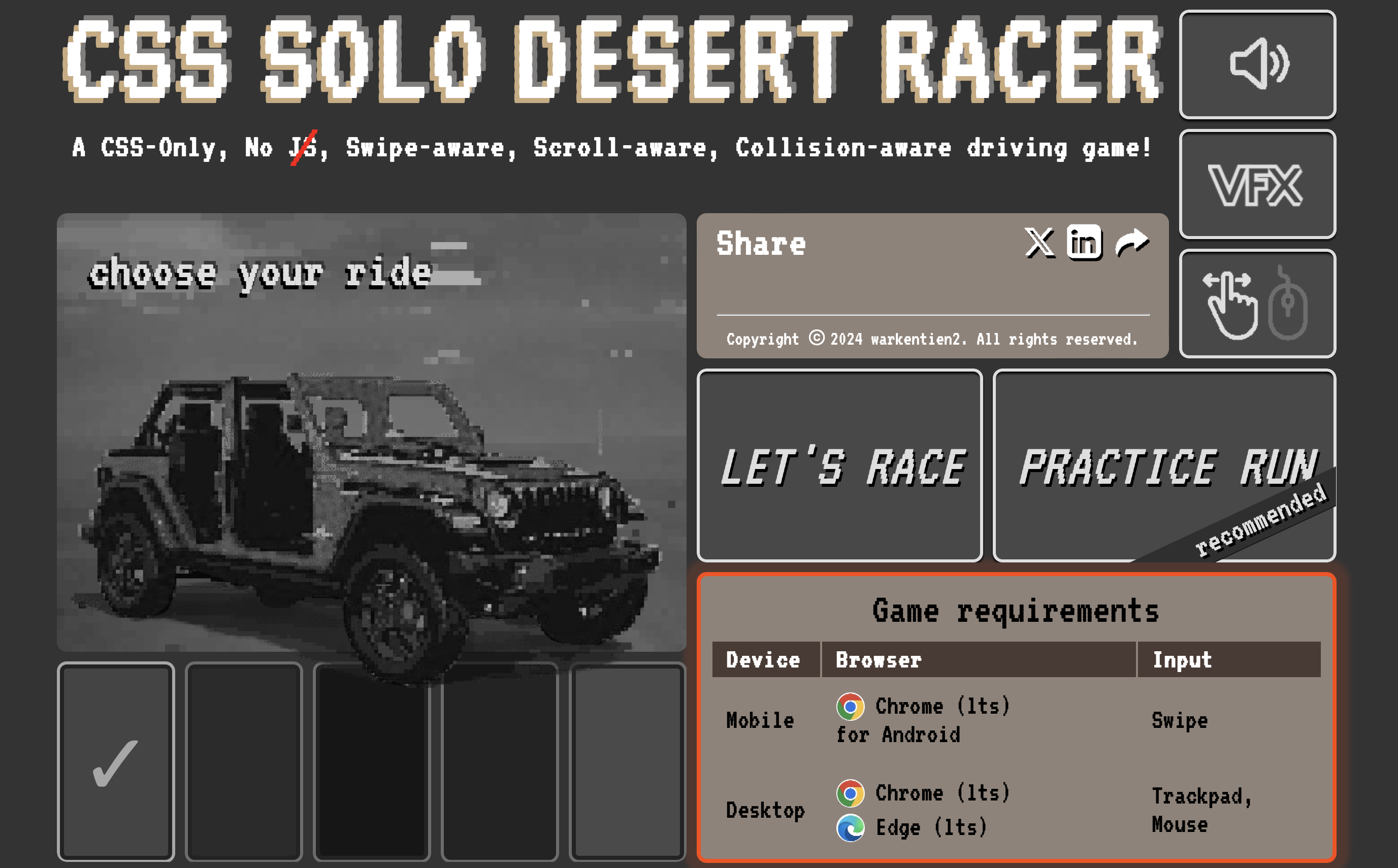 ​​🕹Desert Racer: Первая игра, разработанная исключительно на CSS с возможностью управления свайпом