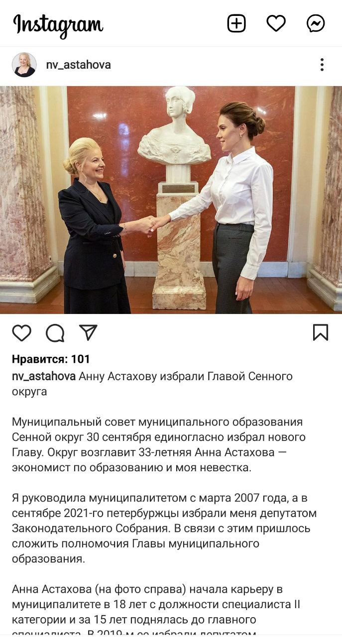 Место главы Сенного округа Наталии Астаховой, избравшейся в ЗакС, заняла ее невестка Анна.