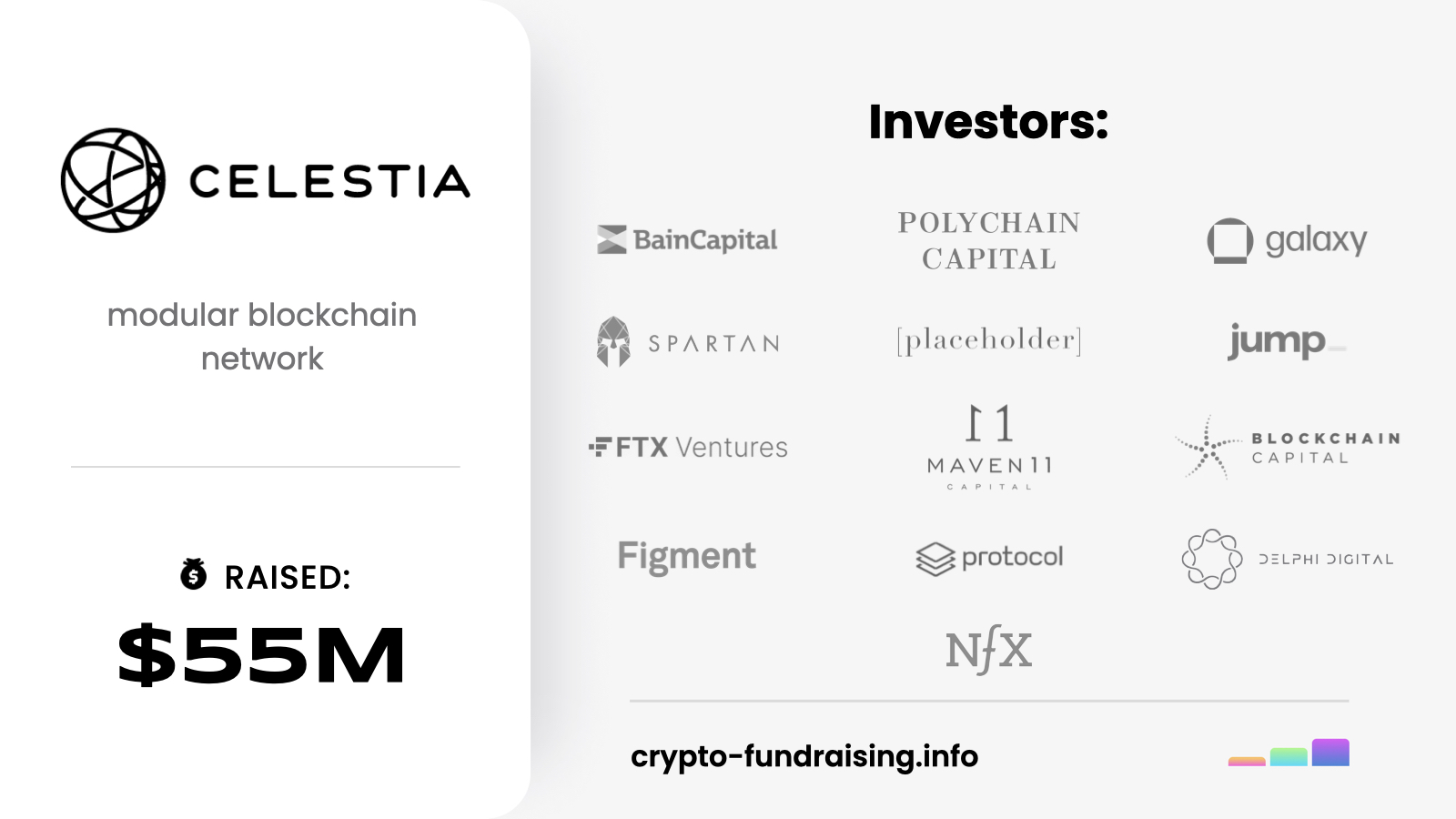 Modular blockchain network Celestia raised $55M in a combined Series A and B round led by Bain Capital Crypto and Polychain Capital, with participation from Placeholder, Galaxy, Delphi Digital, Blockchain Capital, NFX, Protocol Labs, Figment, Maven 11, Spartan Group, FTX Ventures and Jump Crypto.