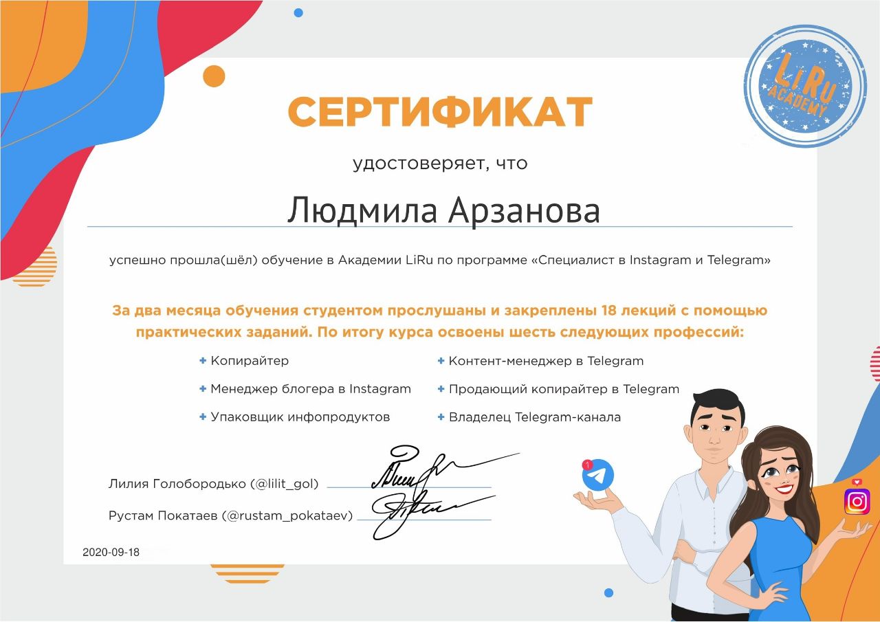 Сертификат о прохождении курсов в LiRu Academy.