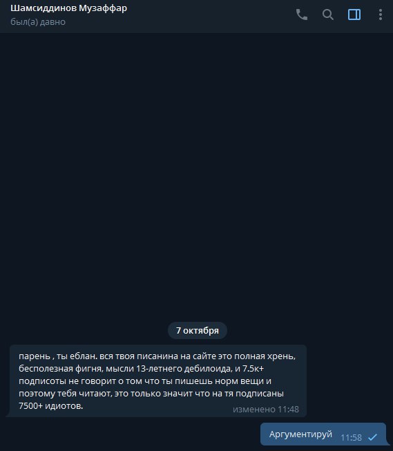 Недавно мне в личку постучался один парень по имени Музаффар. И пишет, значит, пару лестных строчек обо мне и моём канале (см. скрин ниже). Я чуточку удивился и после написал ему лишь 1 слово. После чего, не выдержав моего предложения, он ушёл куда-то далеко, подумать о жизни, наверное.