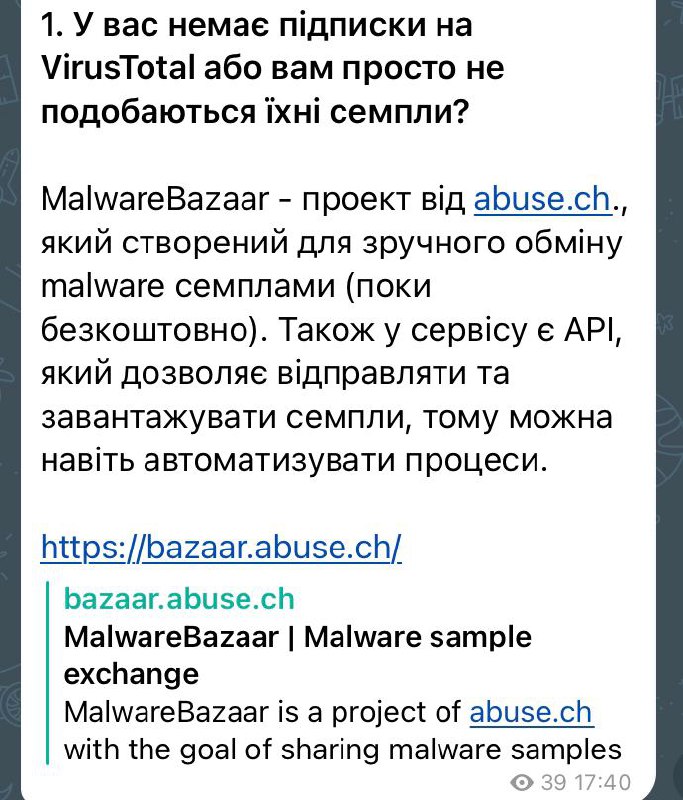 🤼♂️ MalwareBazaar - проект который создан для удобного обмена сэмплами малвари, и что важно бесплатно, и не нужно покупать подписки у #virustotal. Также у сервиса есть #API который позовляет отправлять и скачивать семплы, так что можно даже автоматизировать процессы.