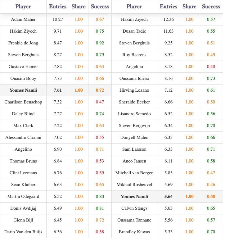 Вы помните, что Перейра одновременно был лидером лиги по проникновениям в финальную треть и проникновениям в штрафную (https://vk.com/xg_blocknote?w=wall-122182507_130779). Намли не выглядит так мощно на фоне голландской лиги, но, по крайней мере, он присутствует в первой двадцатке в обоих списках. Его объем в обоих случаях ниже, чем у Перейры, а точность сопоставима. С одной стороны можно сказать, что Перейра играет в значительно более сильной команде относительно своей лиги, с другой - в голландском чемпионате относительно РФПЛ защищаются очень слабо: пространства больше и атакующие игроки имеют больше времени для принятия решений.
