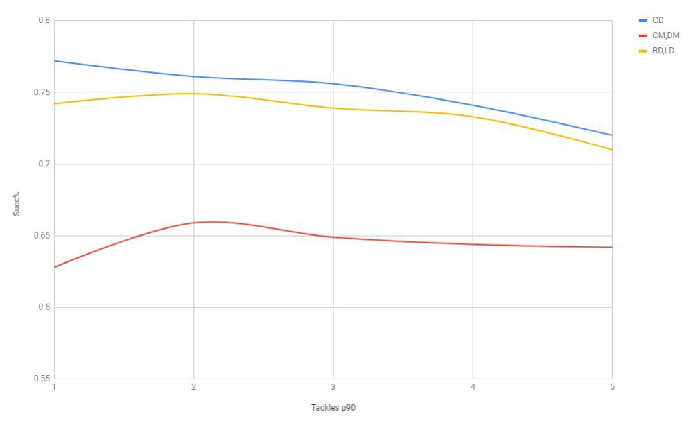 При этом у ЦЗ и крайних защитников с увеличением объема идет плавное снижение процента успешных отборов - об этом важно помнить, когда мы оцениваем игроков по позициям. То есть, если у вас есть два фулбека с отбором 70%, то важно изучить Padj объем. Логическое объяснение: в случае с ЦЗ и крайними защитниками увеличение объема попыток отбора ведет к увеличению менее явных ситуаций, располагающих к успеху (далеко не все ситуации в отборе равны с точки зрения вероятности совершить успешный отбор). К примеру, Ван Дейк, у которого 100% успешных отборов в этом сезоне, построил свою манеру игры таким образом, что просто не выбрасывался в неявных ситуациях и предпочитал держать позицию, чтобы не быть отыгранным.