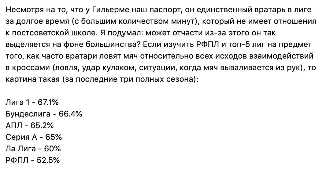 По меньшей мере шесть таких эпизодов за последние два тура, что очень аномально. Понятно, что во многом случайность, что такое большое количество эпизодов всего за пару туров, но частично можно притянуть как продолжение тренда про общую и практически повсеместную проблему у российских вратарей на выходах. Старая тема, что по сравнению с нашей лигой в Европе люди выходят чаще и лучше, а лучшим в нашей лиге уже на длинной дистанции является представительно другой школы: https://vk.com/xg_blocknote?w=wall-122182507_126506