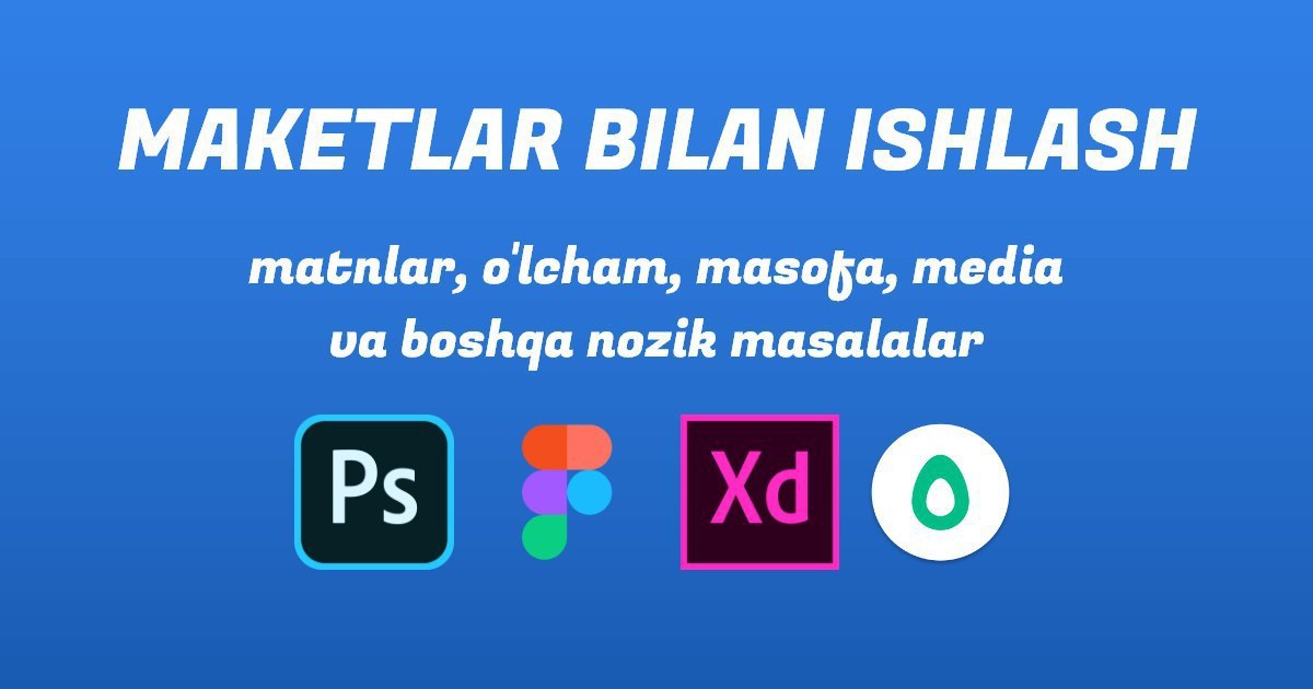 Shuning uchun men o'zbek tilida frontend dasturchi uchun maketlar bilan ishlash bo'yicha videokurs yozishga qaror qildim. Videokursda Adobe Photoshop, Adobe XD, Figma va Avocode dastur va xizmatlaridan foydalanish bo'yicha videodarslar va mashqlar beriladi.