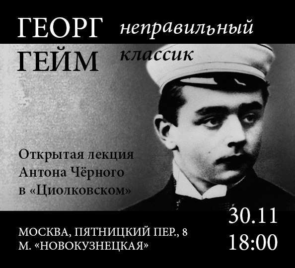 29 ноября 2019 года в книжном магазине «Циолковский» состоялась лекция литературоведа, переводчика и поэта Антона Чёрного «Георг Гейм. Неправильный классик». Георг Гейм (1887—1912) — пророк, предсказавший гибель собственную и Абендланда, и предтеча экспрессионизма…