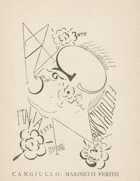 Бессменный вождь итальянского футуризма получил осколочное ранение в бедро 14 мая 1917 года на фронте под Загорой. В госпитале он не теряет даром времени и пишет книжечку-пособие «Как соблазняют женщин». А братья поэты-художники Франческо и Паскуалино Кангиулло создают портрет «Раненый Маринетти» в стиле «слова на свободе».