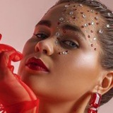 Lighting: intense, focused light coming from the stone, creating soft glowing highlights on her skin.